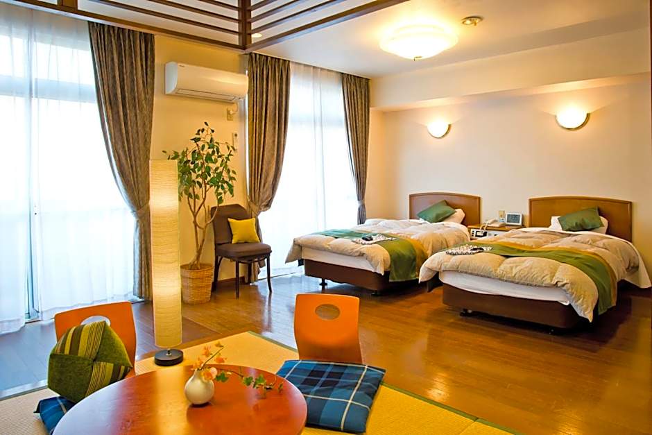 The family room includes a private bathroom, well-fitted with a bath, a shower, a bidet, a hairdryer and slippers. The air-conditioned family room provides a TV, tatami, an electric kettle and yukata. The unit offers 2 beds and 3 futons.