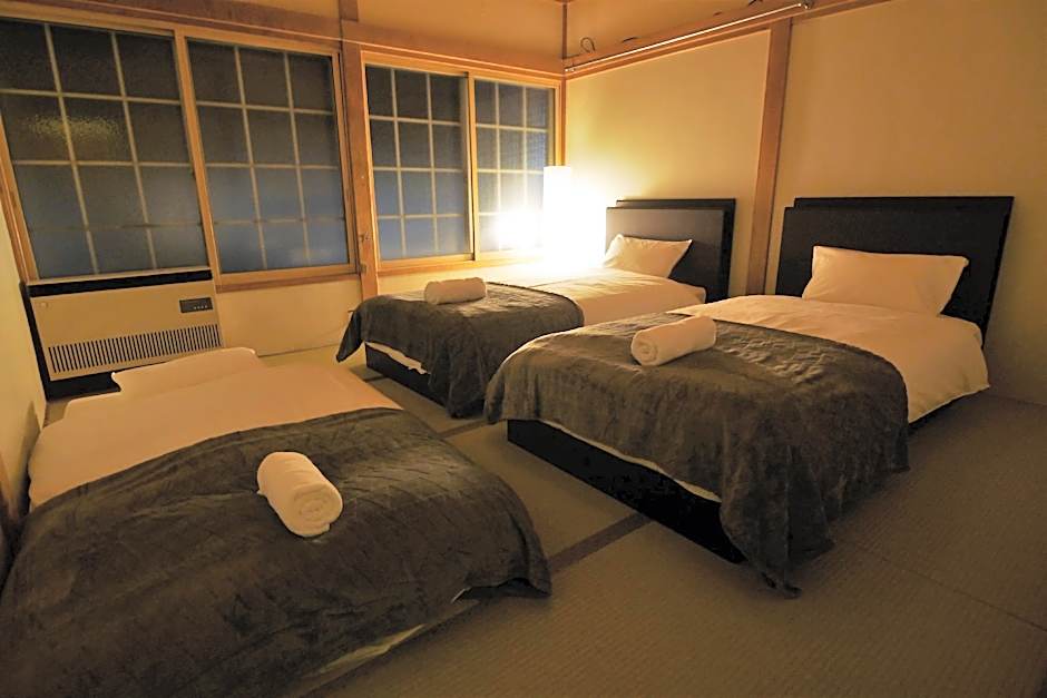 The quadruple room provides tatami, heating, as well as a shared bathroom featuring a shower and a hairdryer. The quadruple room features mountain views. The unit offers 2 beds and 2 futons.