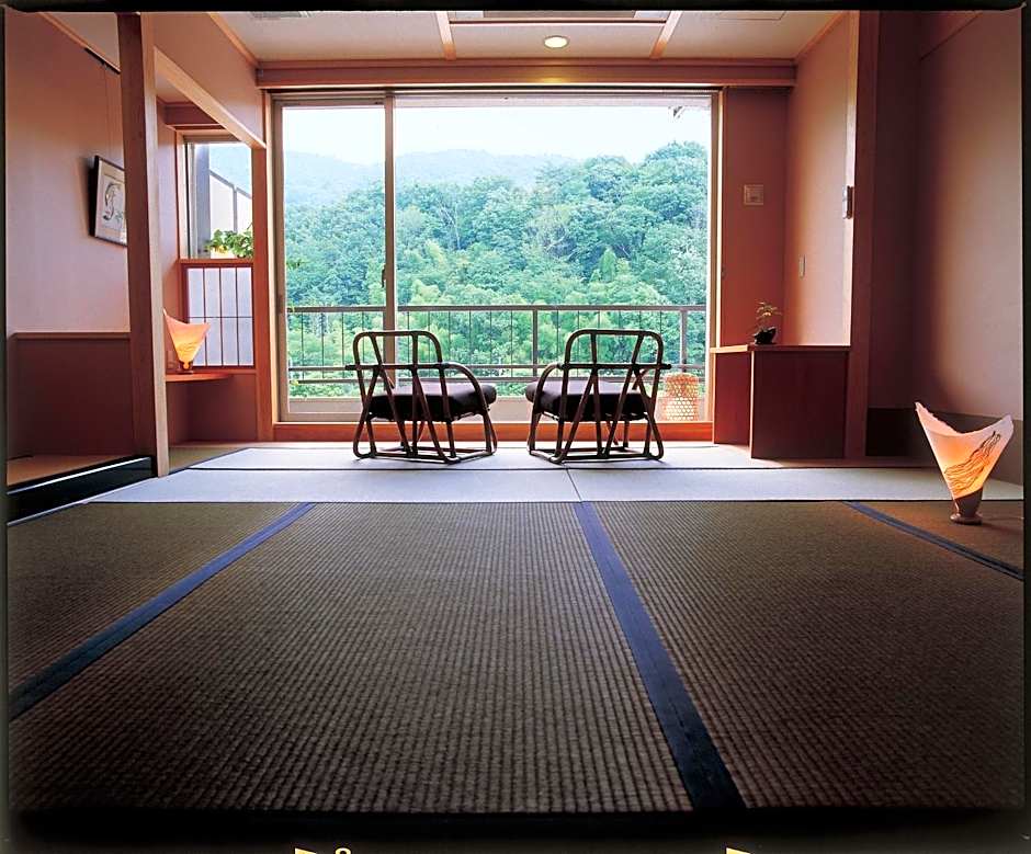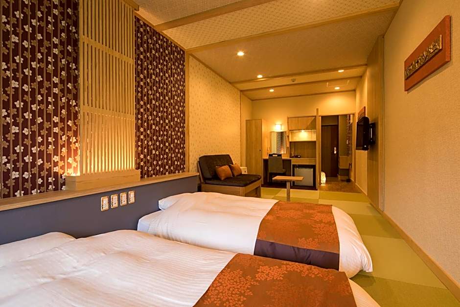More spacious air-conditioned room. Guests sleep in Japanese futon bedding on tatami (woven-straw) floors. A flat-screen TV, fridge and an electric kettle with green tea bags are included. Japanese Yukata robes are provided and room comes with an private bathroom.