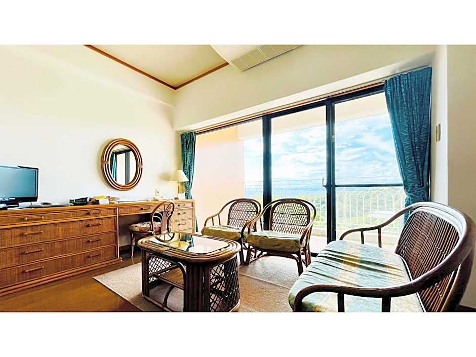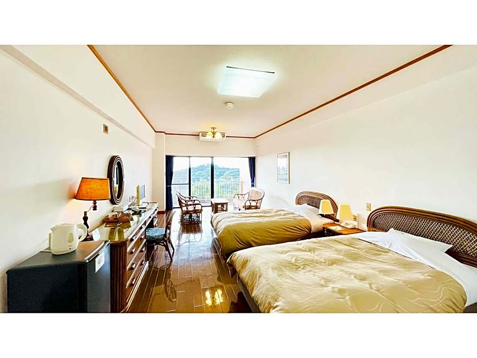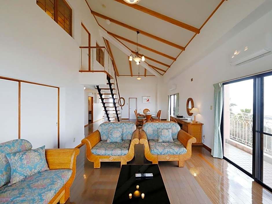 The quadruple room features air conditioning, tatami, a balcony with sea views as well as a private bathroom boasting a bath. The unit has 4 futons.