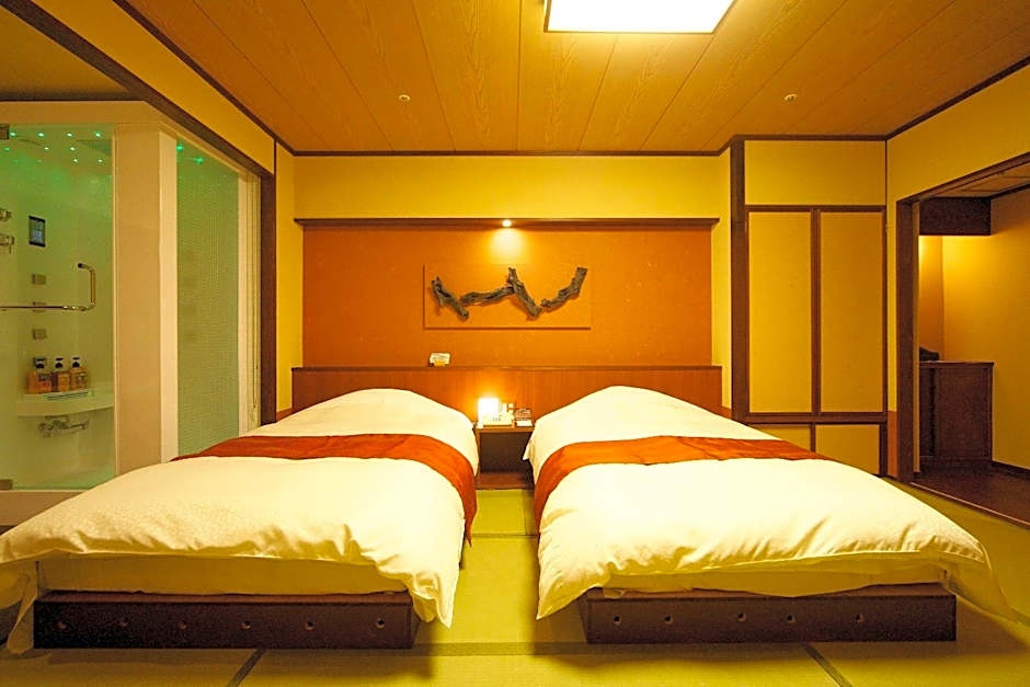 Features Western-style beds and a Tatami (woven-straw) seating area.