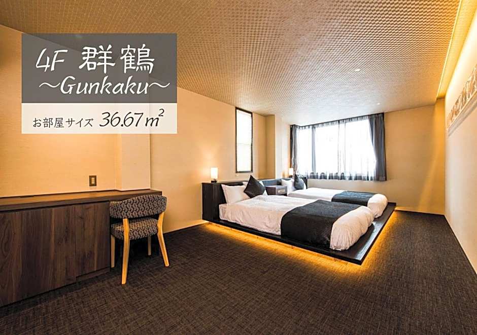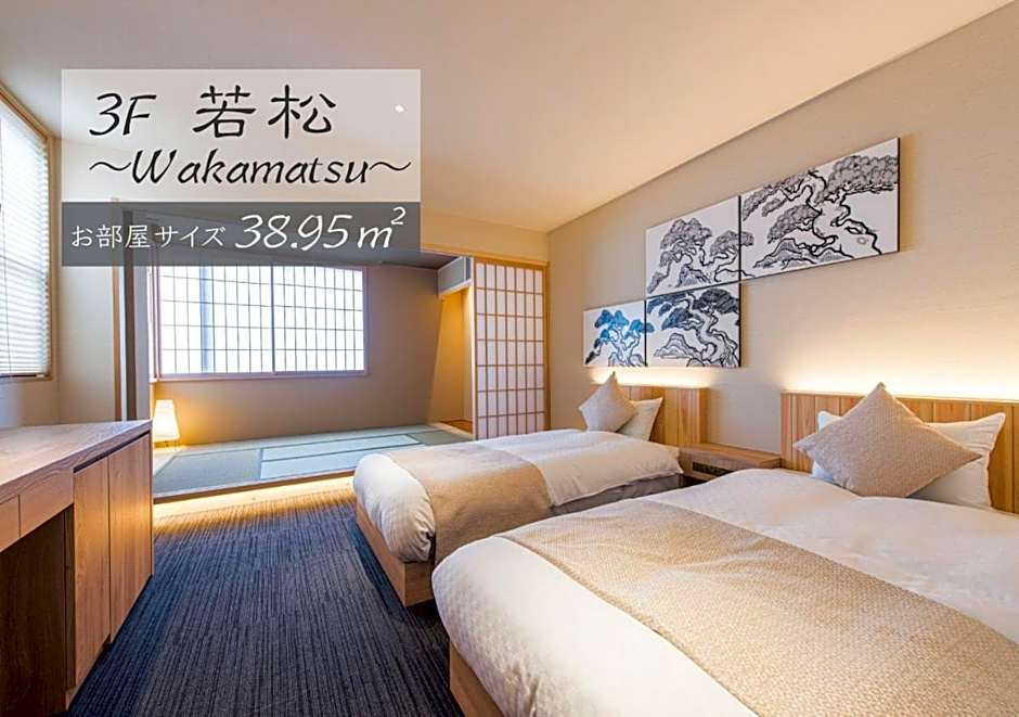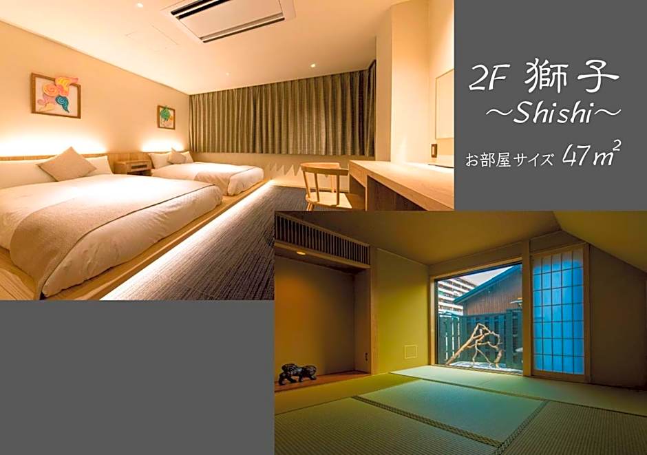 This family room provides a hot tub. The family room includes a private bathroom, well-fitted with a bath, a shower, a bidet, a hairdryer and slippers. This family room is air-conditioned and features a seating area with a flat-screen TV, tatami, a private entrance, soundproof walls, as well as a safe deposit box. The unit offers 2 beds and 2 futons.