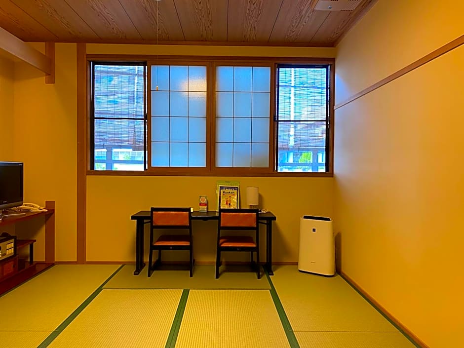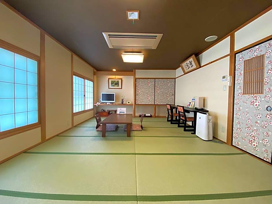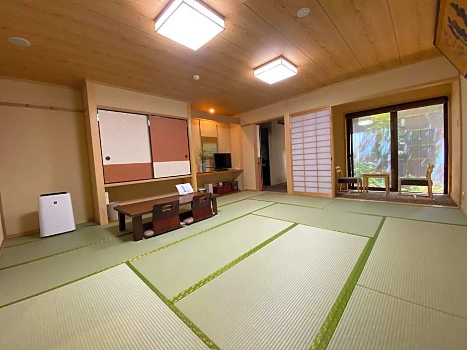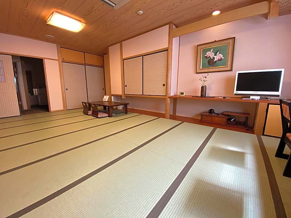 Room with tatami-mat flooring, paper sliding doors and traditional futon bedding. It's fitted with a TV, a fridge and an attached bathroom.