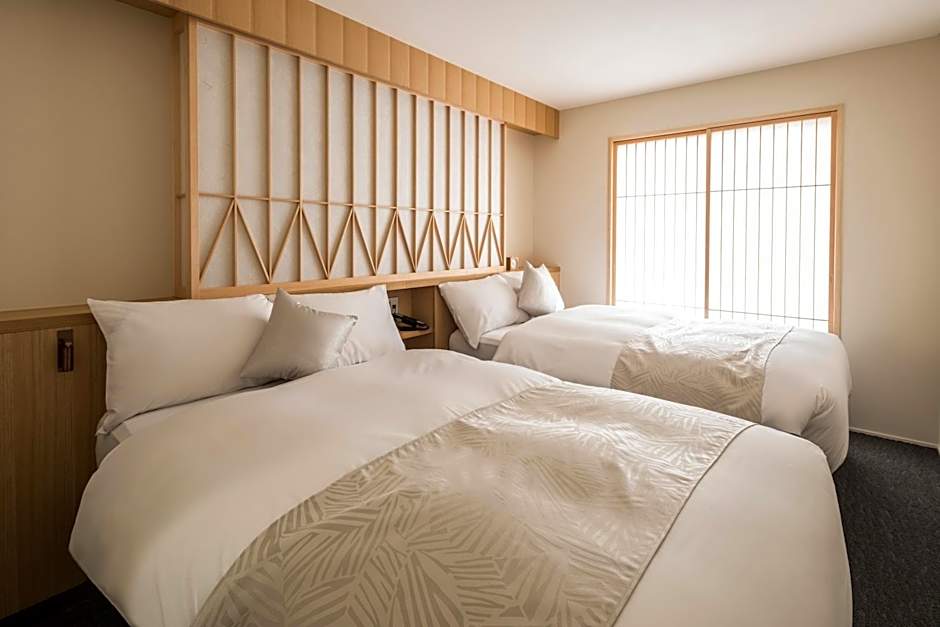 The Tomoya Residence Hotel Kyoto offers a variety of room types including Twin One Bedroom Suites with Kitchenette, Double One Bedroom Suites with Kitchenette, Deluxe Double Rooms with Living Area, and Deluxe Twin Rooms with Living Area. The rooms are non-smoking and range in size from 484 sqft to 592 sqft. The rooms can accommodate up to 3 adults and 2 children, and the bed sizes include Twin beds, Double beds, and Queen size beds.