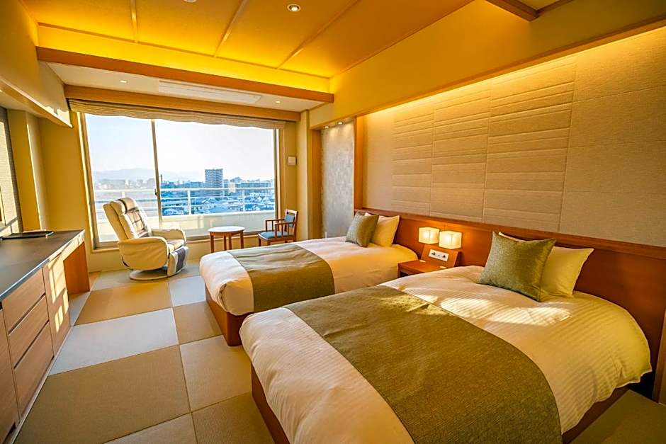 sits in Matsuyama's Dogo district as a 3-star retreat about from the city center, tucked into a lively neighborhood with easy access to local sights. The mailing address at 100 Himezuka, Dogo marks a convenient base for exploration. Free Wi-Fi and a free shuttle service pair with a hot spring bath and a sauna to refresh after a day of wandering. Air conditioning keeps accommodations comfortable, private parking is available for an extra charge, and meeting/banquet facilities carry an additional fee. On-site features include a 24-hour front desk, non-smoking rooms, a garden, and an elevator to upper floors.