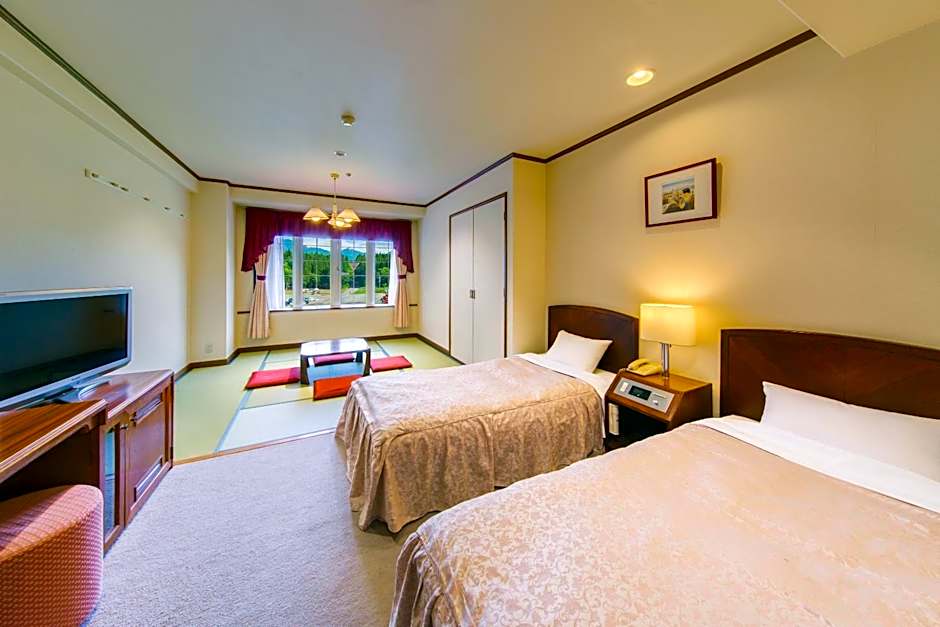 The spacious twin room provides air conditioning, tatami, as well as a private bathroom featuring a bath and a shower. This twin room features an electric kettle, heating and a flat-screen TV. The unit offers 2 beds and 4 futons.