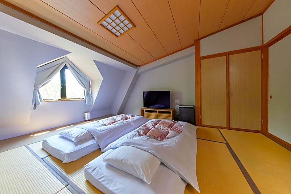 Features tatami (woven-straw) flooring and traditional futon bedding. Room is equipped with a fridge, an electric kettle and a flat-screen TV. Includes an en suite toilet. Bathroom is shared with other guests.