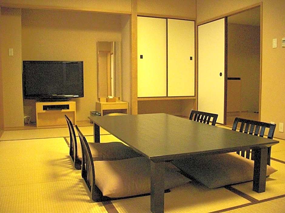 Room featuring a tatami (woven-straw) floor, on which traditional futon bedding is spread to sleep in. It's fitted with a low table with seating cushions and a TV. Bathing facilities and toilets are shared.