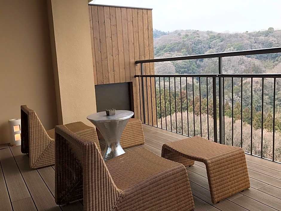 This family room faces the mountain and has a balcony, seating area and electric kettle. Guests can relax in the open-air bath while looking out into the forest surrounding the property.