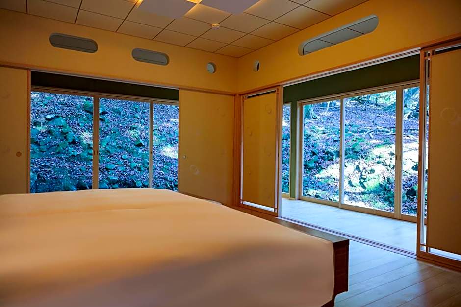 Features tatami (woven-straw) flooring and Japanese futon bedding. Larger room with a fridge. Includes an private bathroom with Western toilet.