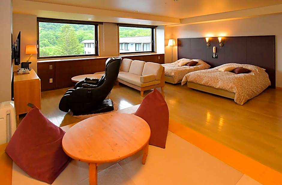 Hotel Kanronomori offers a variety of room types including suites, twin rooms, and Japanese-style rooms. The occupancy of the rooms ranges from 2 adults to 5 adults with children. All rooms are non-smoking and feature amenities such as Futon Mats, Double beds, Twin beds, and sofa beds. Room sizes range from 323 sqft to 861 sqft, providing ample space for families and groups.