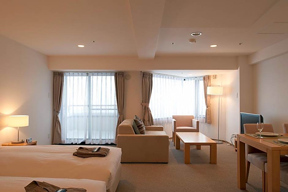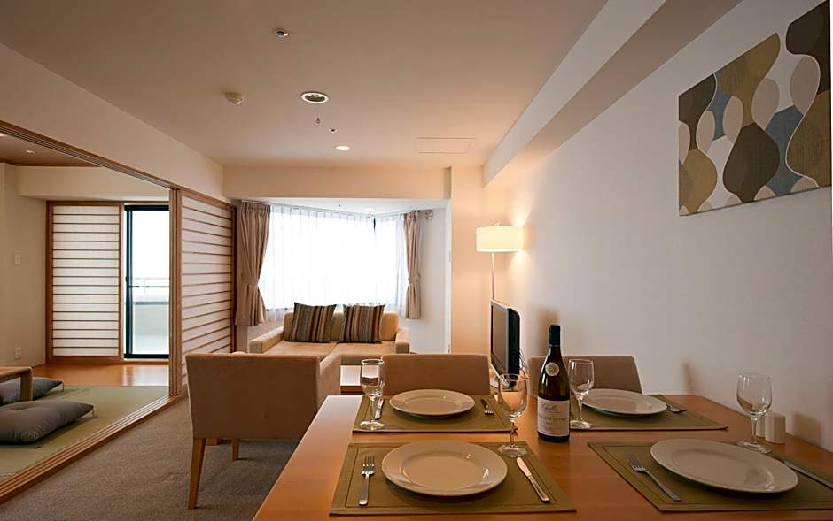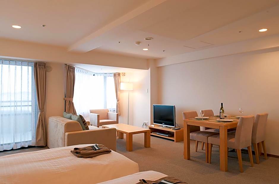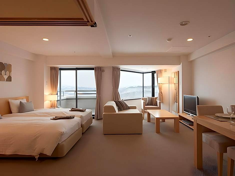 Suite featuring mountain views through large windows, a bedroom with a large double bed and a comfortable living room. It comes with a dining area, a kitchenette and a Japanese-style room which offers a tatami (woven mat) floor, a balcony and traditional futon bedding for 2 people. Amenities include a flat-screen TV and a tea maker.