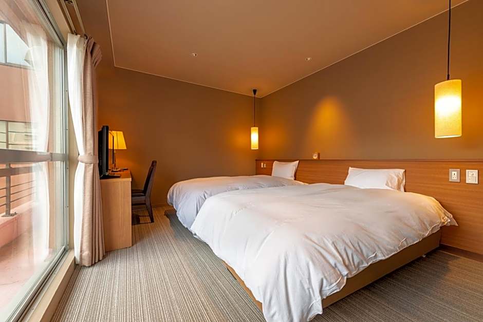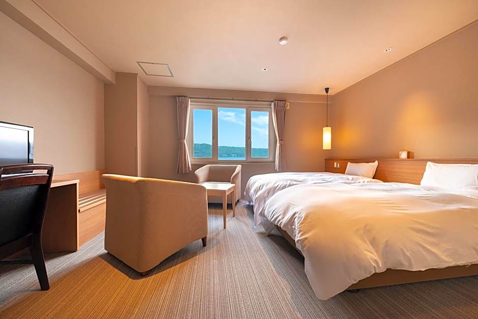The spacious twin room offers a wardrobe, a safe deposit box, as well as a private bathroom featuring a shower and a hairdryer. The twin room provides an electric kettle, yukata, heating, a flat-screen TV, as well as lake views. The unit offers 3 beds.