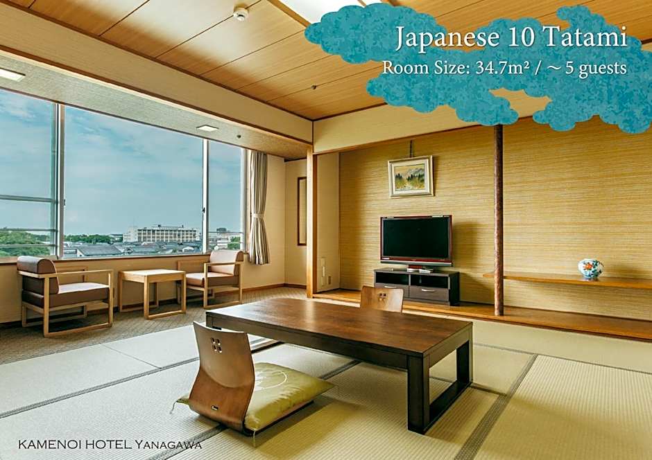 The spacious quadruple room features air conditioning, tatami, as well as a private bathroom boasting a bath and a shower. The quadruple room offers a flat-screen TV, a seating area, an electric kettle, heating as well as river views. The unit has 2 beds and 3 futons.