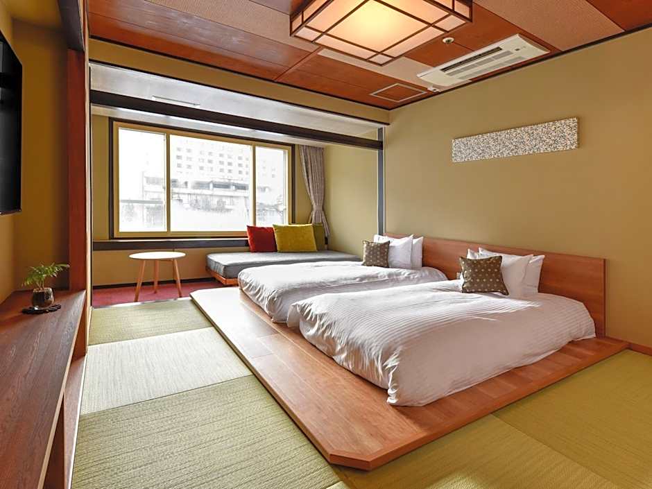 The spacious quadruple room offers air conditioning, tatami, as well as a private bathroom featuring a bath and a shower. The unit offers 2 beds and 2 futons.
