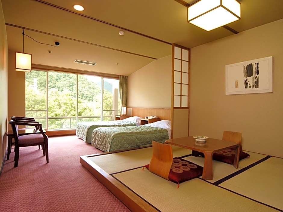 Featuring free toiletries, this twin room includes a private bathroom with a bath, a shower and a hairdryer. The air-conditioned twin room features a flat-screen TV with satellite channels, tatami, a wardrobe, a safe deposit box as well as mountain views. The unit has 2 beds and 1 futon.