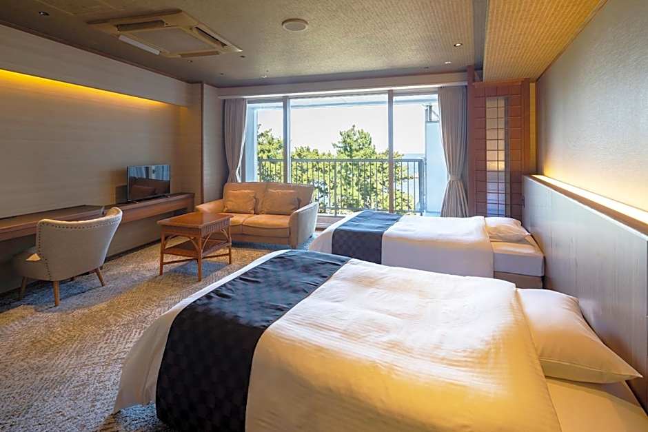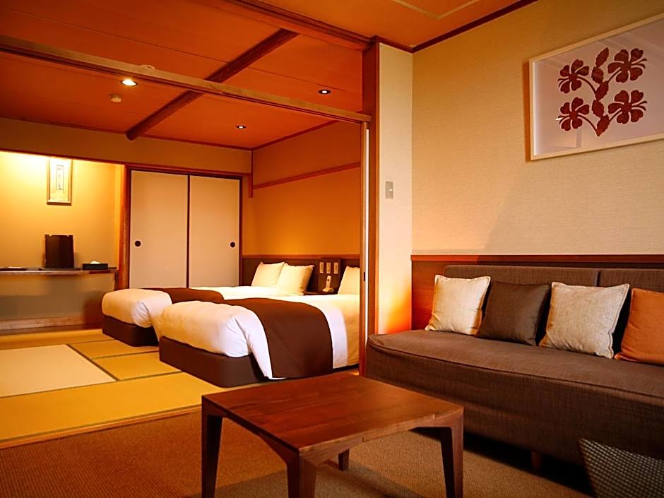 Offering free toiletries, this quadruple room includes a private bathroom with a bath, a shower and a hairdryer. The spacious air-conditioned quadruple room offers a flat-screen TV, tatami, a mini-bar, a tea and coffee maker as well as sea views. The unit offers 5 futons.