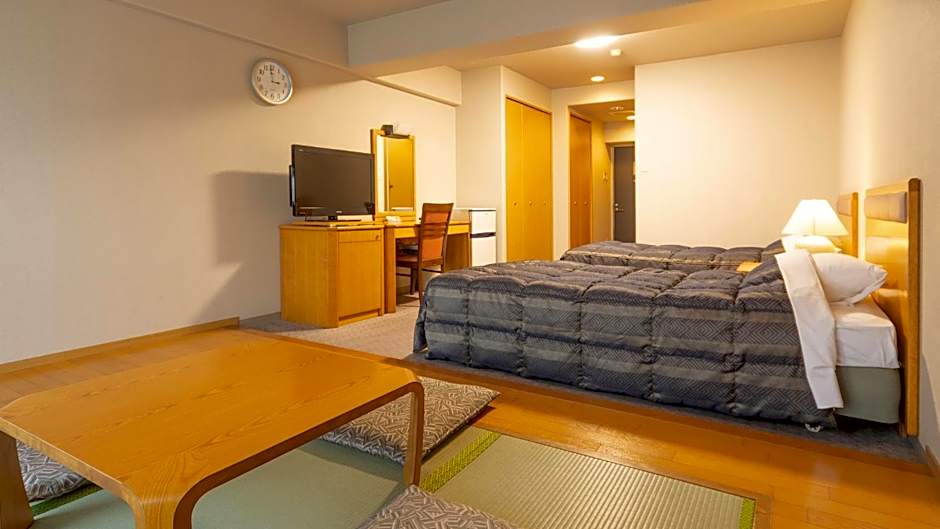 Room options span a range of styles, from a Double Room with a queen bed (non-smoking, accommodates up to 4 adults and 3 children) to a Smoking Allowed Double Room with a twin bed. Larger choices include a Suite with Mountain View and a Junior Suite, alongside other configurations like Japanese Western Mixed (Smoking Allowed) and Standard or Quadruple Rooms, offering varied layouts to suit different groups.
