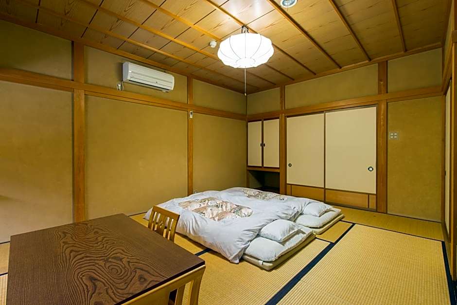 Spacious room overlooking the garden and the majestic Hida mountain range. It features a Japanese interior with a tatami (woven-straw) floor, a low table with seating cushions and Japanese futon bedding. All come with a flat-screen TV, a refrigerator and a private bathroom.