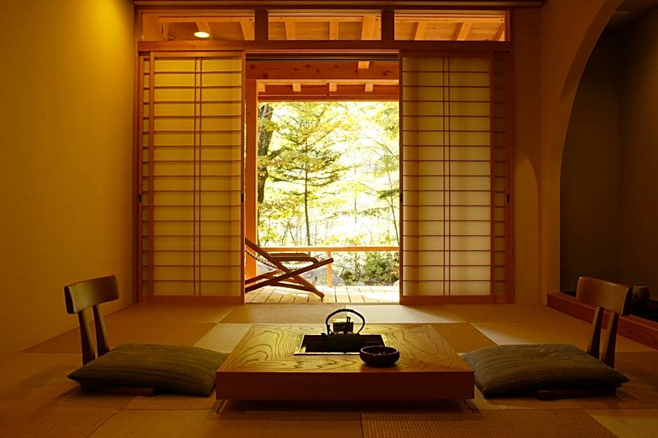 This twin room features a private open-air bath and a spa bath. The spacious twin room features air conditioning, tatami, a terrace with garden views as well as a private bathroom boasting a shower. The unit has 2 futons.