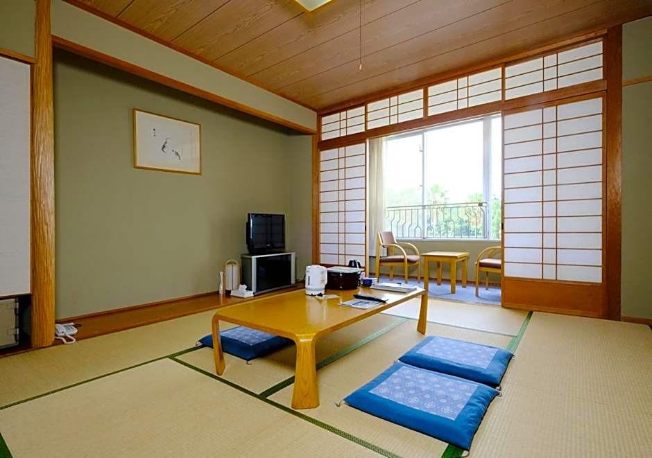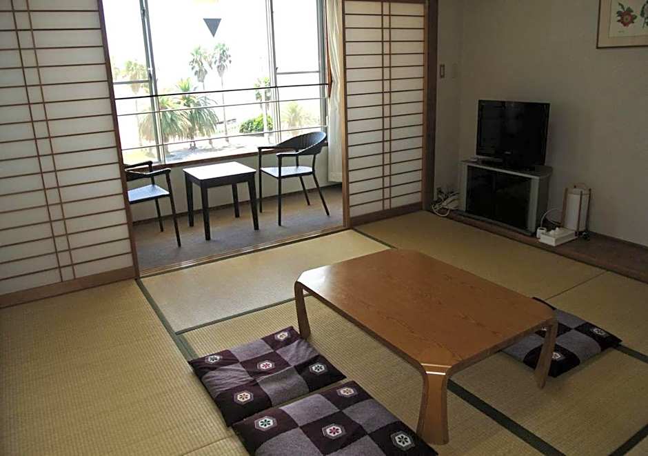 The air-conditioned quadruple room offers a flat-screen TV, tatami, a safe deposit box, an electric kettle as well as garden views. The unit offers 4 futons.