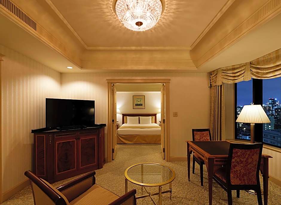 Room featuring views of Okuma Garden through a bay window, vaulted ceilings and a classic Italian decor. French doors connect the bedroom to the living room, which features a sofa, a TV and a mini-bar. Bathrooms offer a marble countertop with double sinks, a bath tub and complimentary toiletries. Free Wi-Fi is provided.
