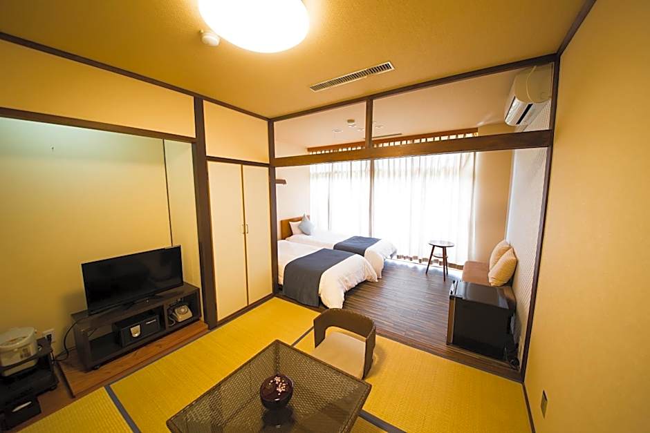 Offering free toiletries, this twin room includes a shared bathroom with a bidet and slippers. The air-conditioned twin room offers a flat-screen TV, tatami, a private entrance, a wardrobe as well as mountain views. The unit has 2 futons.