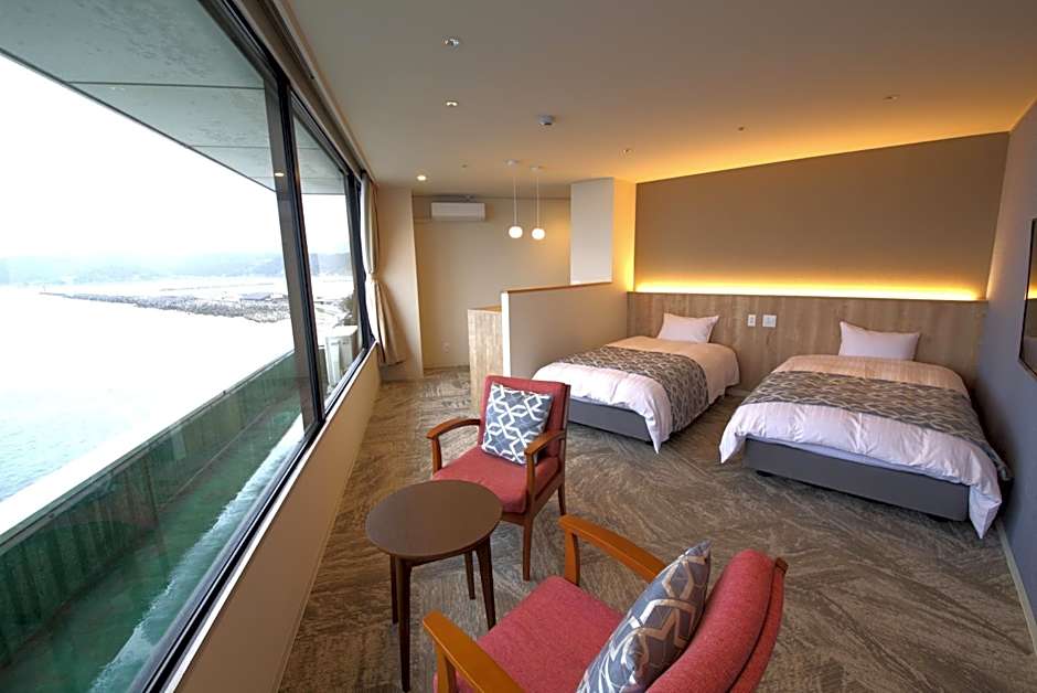 Providing free toiletries, this twin room includes a shared bathroom with a bidet and slippers. The air-conditioned twin room provides a flat-screen TV, tatami, a private entrance, a wardrobe as well as sea views. The unit offers 5 futons.