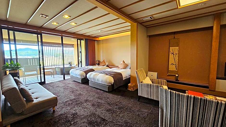 This quadruple room's special feature is the private open-air bath. The spacious quadruple room provides air conditioning, tatami, a balcony with river views as well as a private bathroom featuring a bath. The unit offers 2 beds and 2 futons.