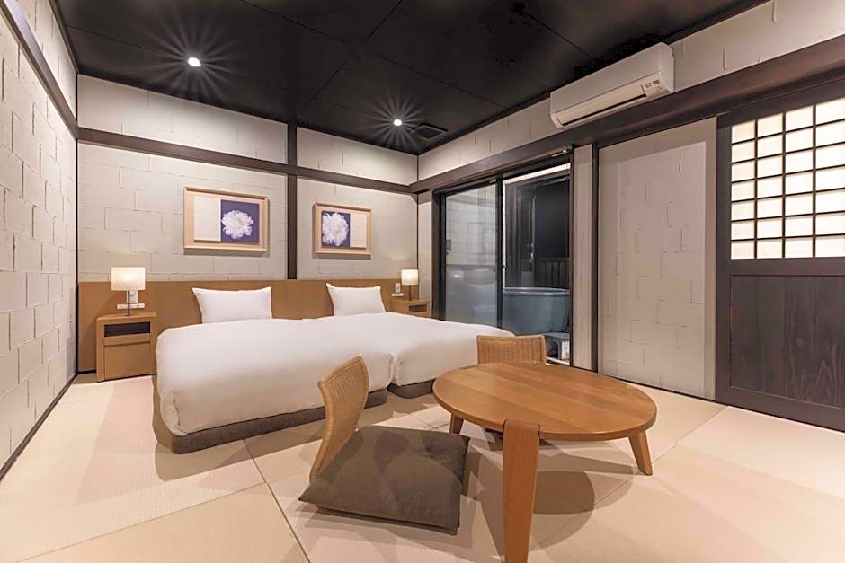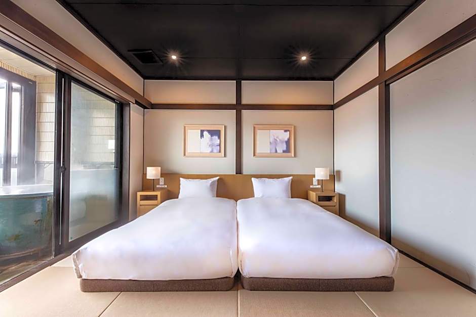 The hot tub is the standout feature of this twin room. The twin room includes a private bathroom, well-fitted with a bath, a shower, a bidet, a hairdryer and slippers. The spacious air-conditioned twin room features a flat-screen TV, tatami, soundproof walls, a tea and coffee maker as well as mountain views. The unit has 2 beds.