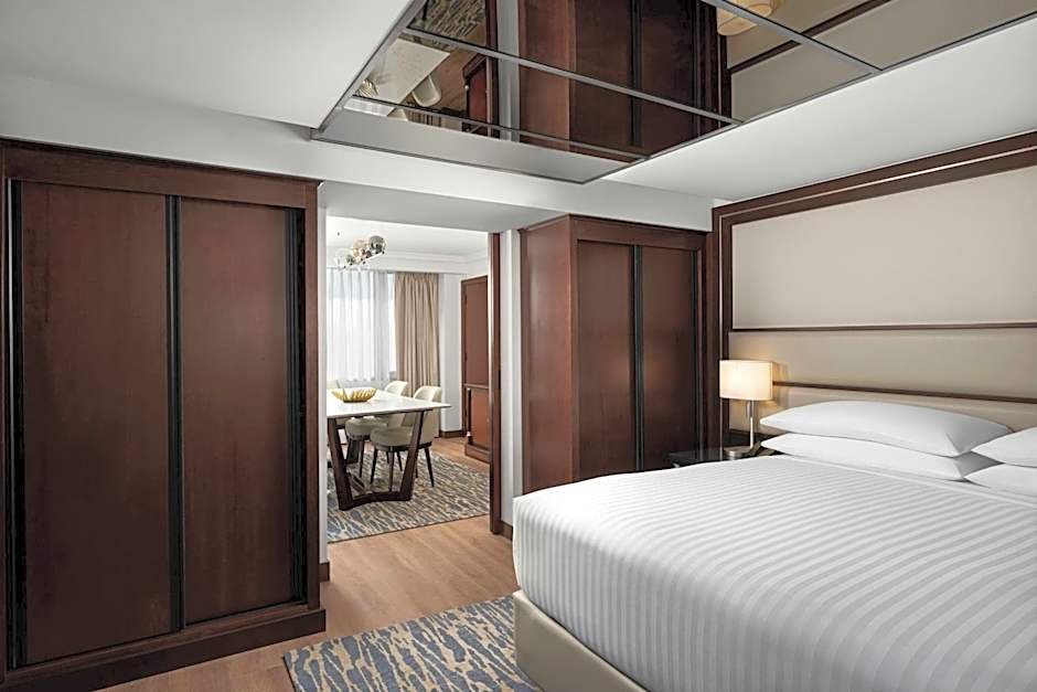 At Amman Marriott Hotel, guests can choose from a variety of room types including Deluxe Rooms with 1 King or 2 Double beds, Executive Rooms with 1 King bed, and Suites with 1 King bed. The rooms are non-smoking and range in size from 291 sqft to 1292 sqft. The accommodations can comfortably accommodate 2 adults and 1 child, or 3 adults and 1 child.