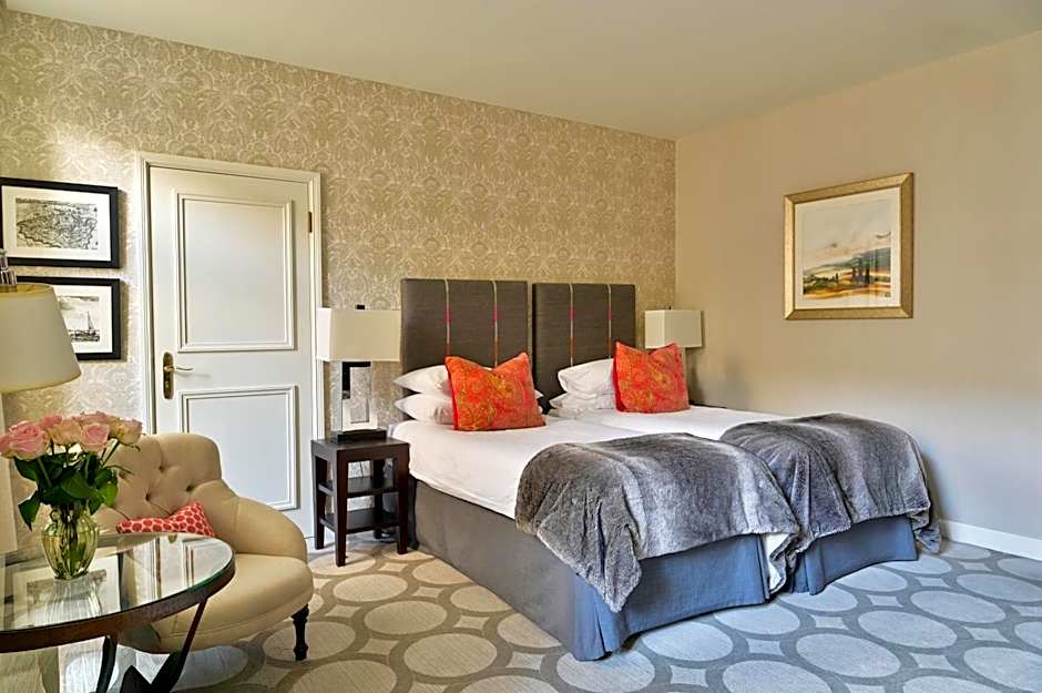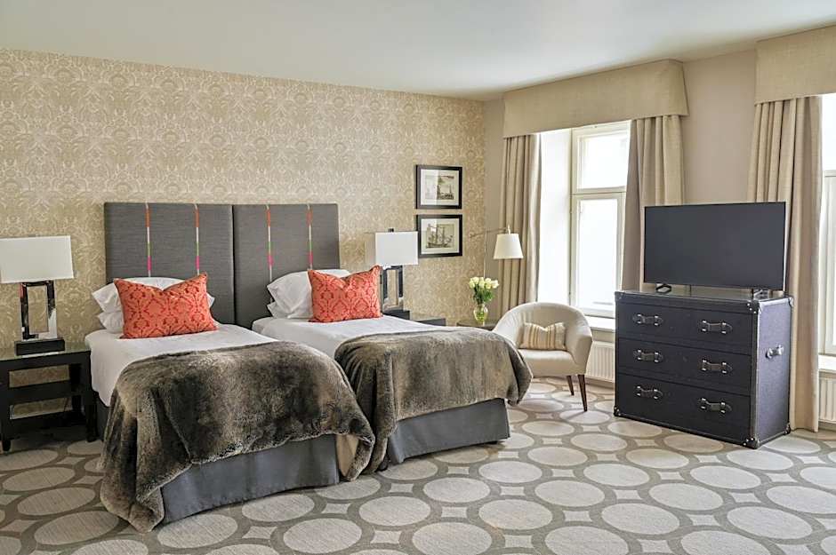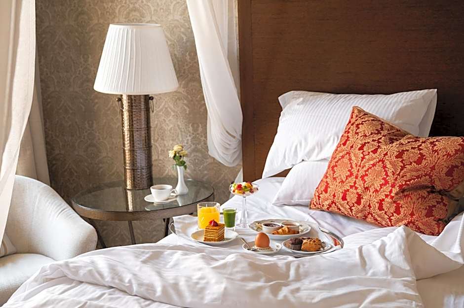 Business and leisure travelers appreciate the quality and amenities of Deluxe rooms which are decorated with precious fabrics and furnishings. 24 square yard, 2 single beds, air-conditioning, high-speed Wi-Fi, flat screen TV, safe, mini-bar, coffee, tea making facilities, armchair, desk and guest amenities. Bathroom with heated tile floor features bathtub with shower, slippers, bathrobe, hairdryer and sustainable, organic, vegan luxury bathroom amenities.