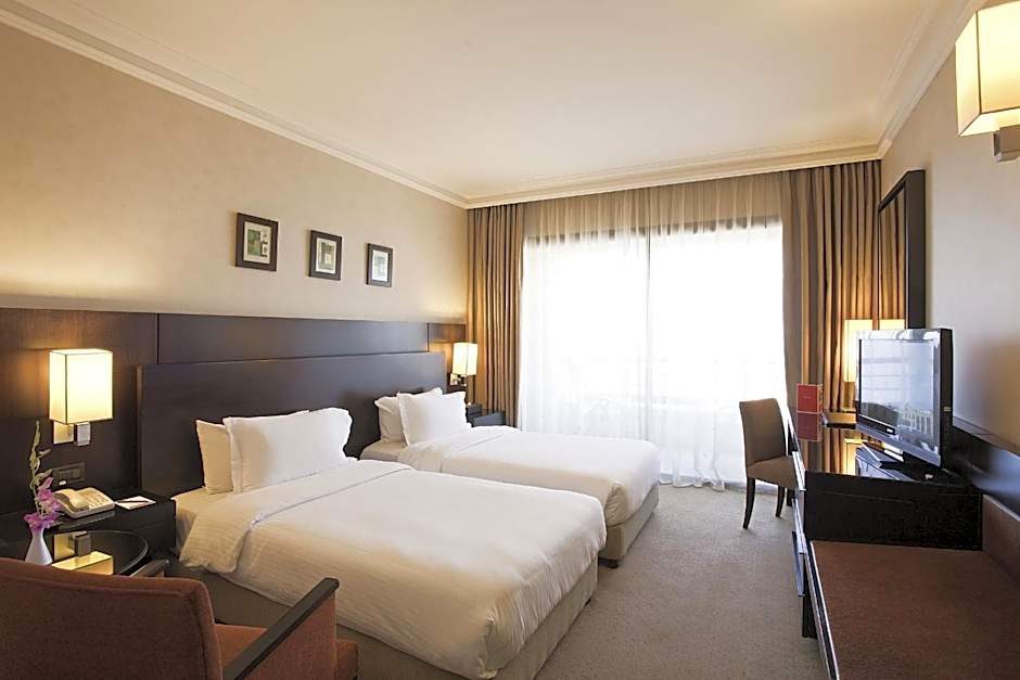 The Ramada Plaza by Wyndham Beirut Raouche offers a variety of room types including Twin rooms, Triple rooms, and Suites. All rooms are non-smoking and have a room size of 291 sqft, except for the Suites which range from 506 sqft to 1367 sqft. The rooms can accommodate up to 3 adults and 1 child, and the beds are either Queen size or Twin beds.