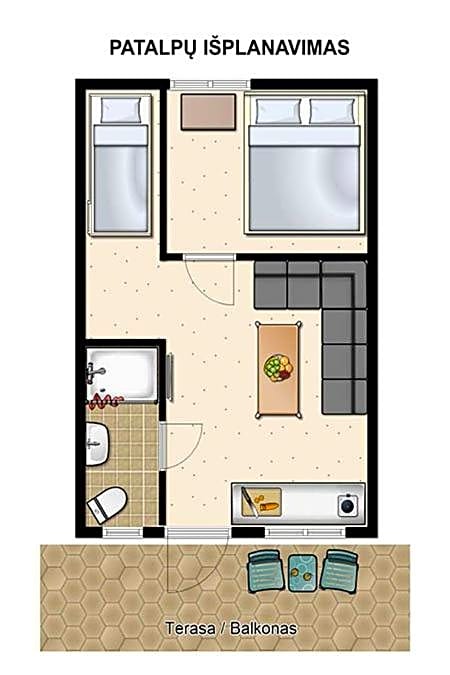 A bright apartment with a living room and a fully equipped kitchenette. Each features access either to a common terrace on the ground floor or to a common balcony on higher floors