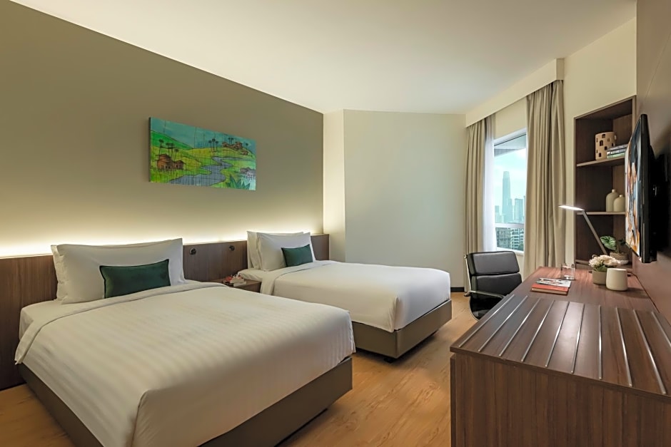 At Oakwood Hotel and Residence Kuala Lumpur, guests can enjoy various leisure amenities during their stay. They can spend time by the outdoor swimming pool, which offers a view and has a shallow end. Adults can relax by the pool as it has age restrictions for a serene experience. Moreover, guests can dine at the on-site TrEat Restaurant & Bar, known for its family-friendly and modern ambiance. For those traveling with children, there is a separate kids' pool available. Furthermore, the hotel provides a fitness center for those looking to stay active, and guests can also enjoy the sun deck to relax and soak in the sun.