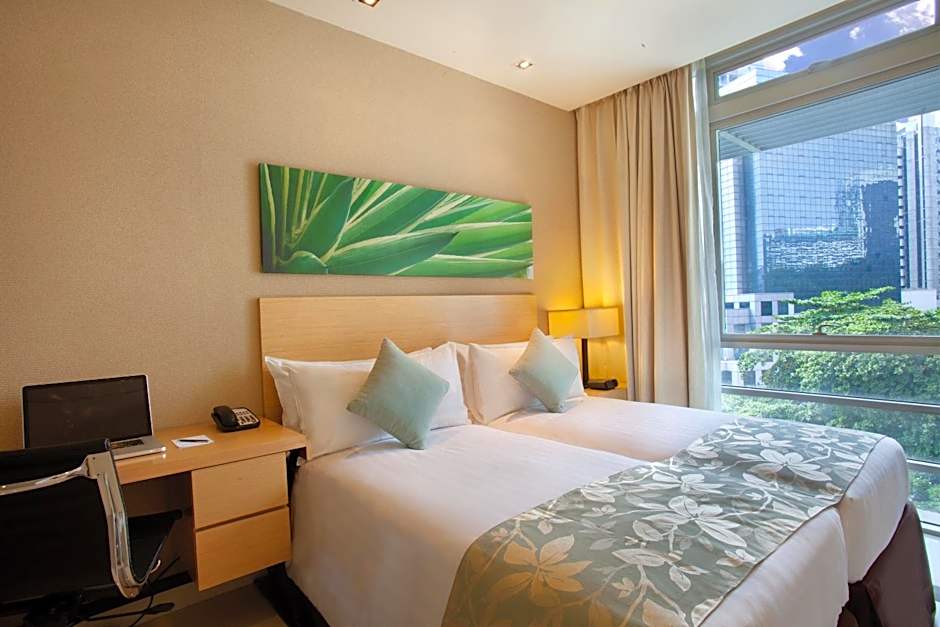 Appointed with 2 single beds and modern amenities, this suite overlooks the city. It is fitted with a seating area and a 40-inch flat-screen TV. The private bathroom includes separate bath and shower.