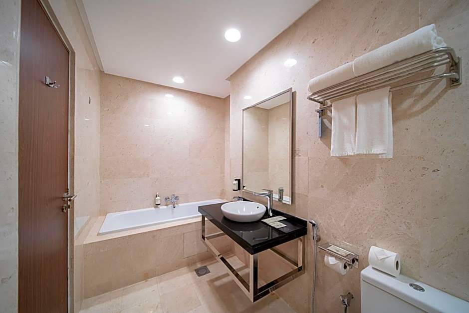 This larger air-conditioned deluxe double room opens up to views of the city. The seating area is fitted with a flat-screen satellite TV, a sofa and a desk. The private bathroom includes a bathtub, a hairdryer and free toiletries.