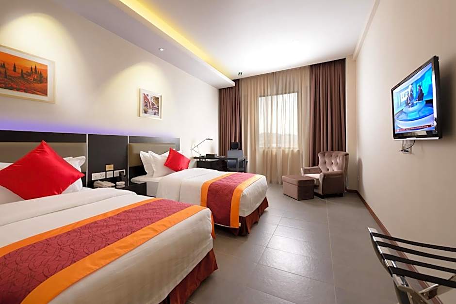 Room types at the E-Red Hotel Kuantan include Deluxe Rooms, Superior Rooms, and Family Rooms. Occupancy ranges from 2 to 4 guests per room. Bed sizes include twin, queen, and king, with room sizes varying based on the room type. Smoking is not allowed in any of the rooms.