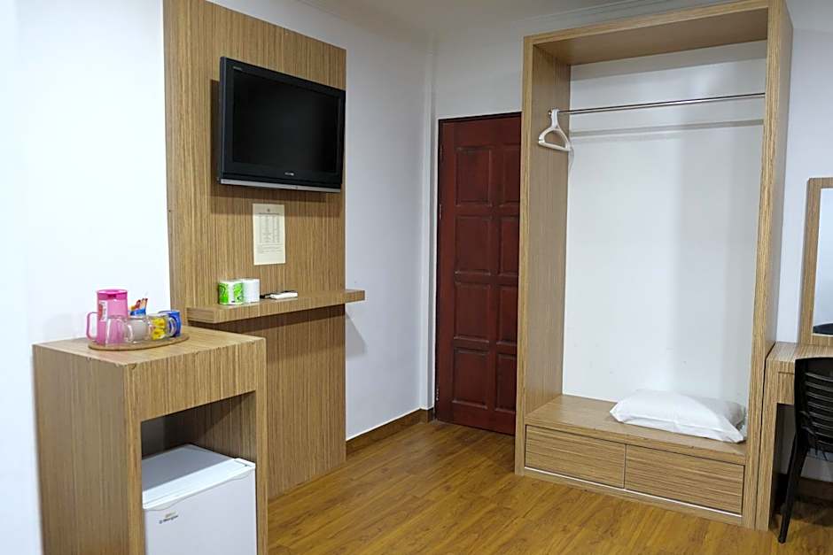 A simple room fitted with tiled flooring, a cable TV and a private bathroom with hot shower facilities.