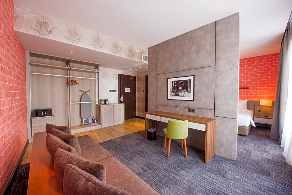 This suite features a living room, a bedroom, and a spacious bathroom. Amenities included are a mini-bar, air conditioning and electric kettle.