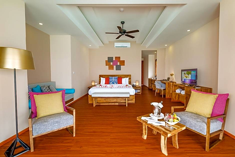 The Beach Villa comes with a pool, which opens into a rear garden that leads to a tranquil beach on the lagoon side of the island . A small step on the beach reveals the vista of the azure lagoon. It features a spacious bedroom with seating area, a bathroom with outdoor rain shower and bath tub.