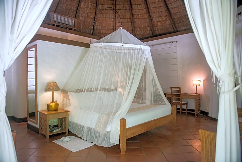 Features a high ceiling and a four-poster bed with mosquito net.