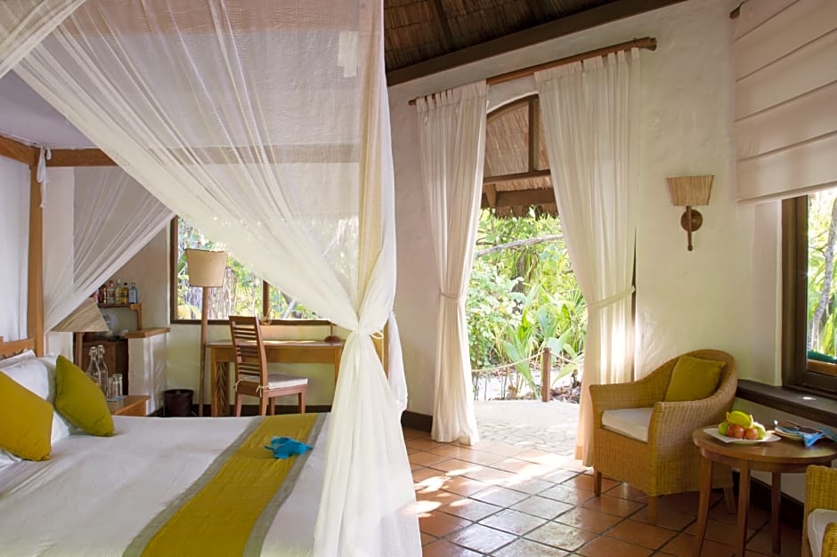 The spacious bedrooms feature a high-pitched ceiling, air-conditioning and an overhead fan. Each villa has a private terrace with outdoor seating and open-air garden bathrooms.