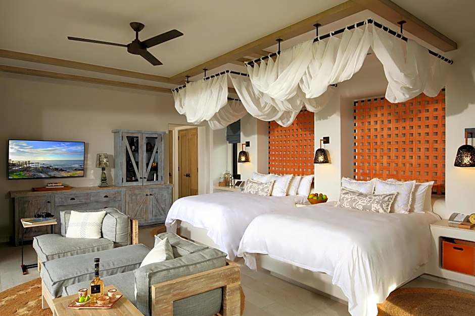 At Esperanza - An Auberge Resort, guests can choose from a variety of room types including Double rooms, Apartments, and Suites. The occupancy ranges from 3 adults and 1 child to 9 adults and 4 children, with bed sizes including King size, Twin, and Sofa beds. All rooms are non-smoking and offer spacious accommodations, with room sizes ranging from 624 to 5500 sqft.
