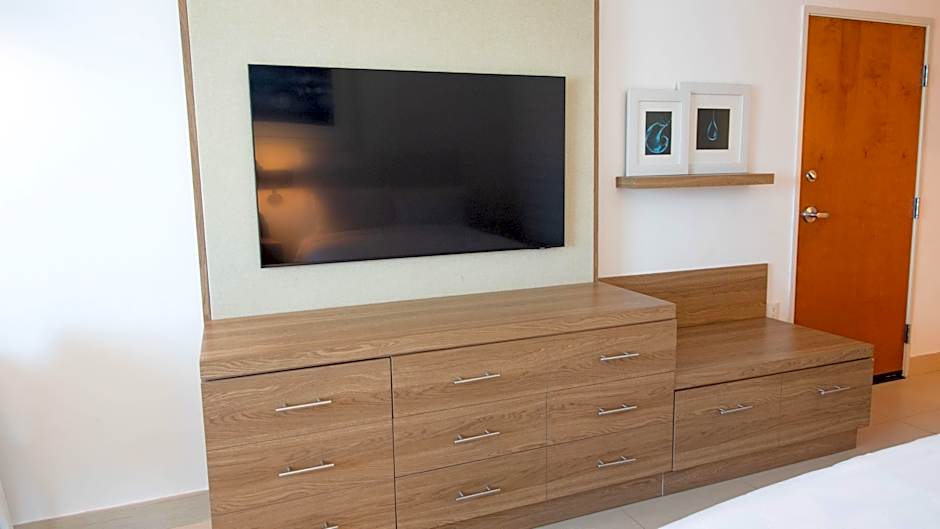 The King Suite offers a working desk with ergonomic chair, telephone line, free Wi-Fi, radio and alarm clock. There is also available 2 flat-screen TVs with cable channels and a seating area, and a coffee maker. The bathroom has a modern design and offers free toiletries and hairdryer. The room also features a safety deposit box, air conditioning and ironing facilities.