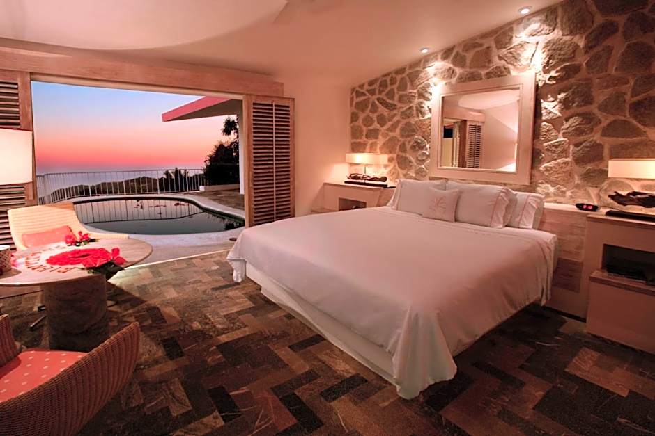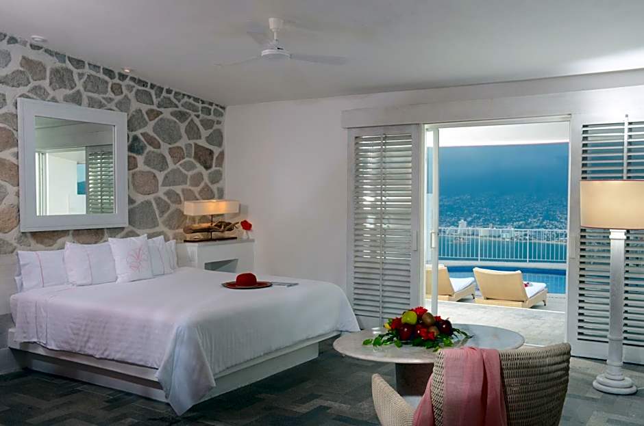 Located on the second or third level, this room features a private pool and views of Acapulco Bay or the Pacific Ocean. The room is furnished with one king bed or 2 double beds. The bathroom features a shower, bathrobes and Deluxe bathroom amenities. There is also a balcony or terrace, private pool with lounges and chairs.