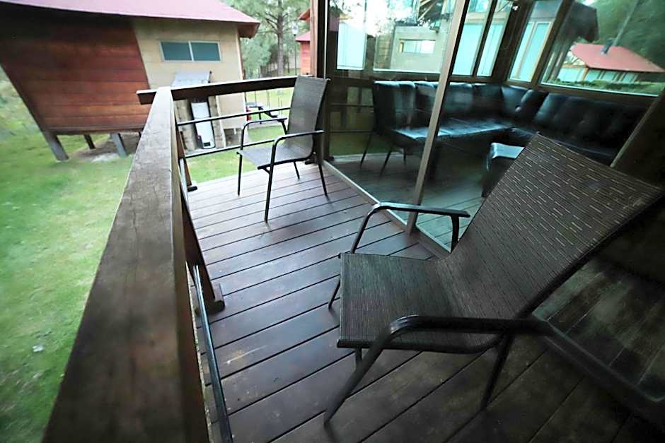 This luxury cabin with balcony features 2 bedrooms with 1 queen-size bed each. It also includes living area with a fireplace and a hot tub for up to 4 people.