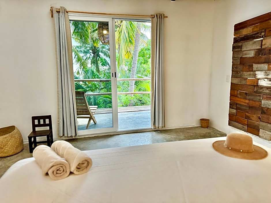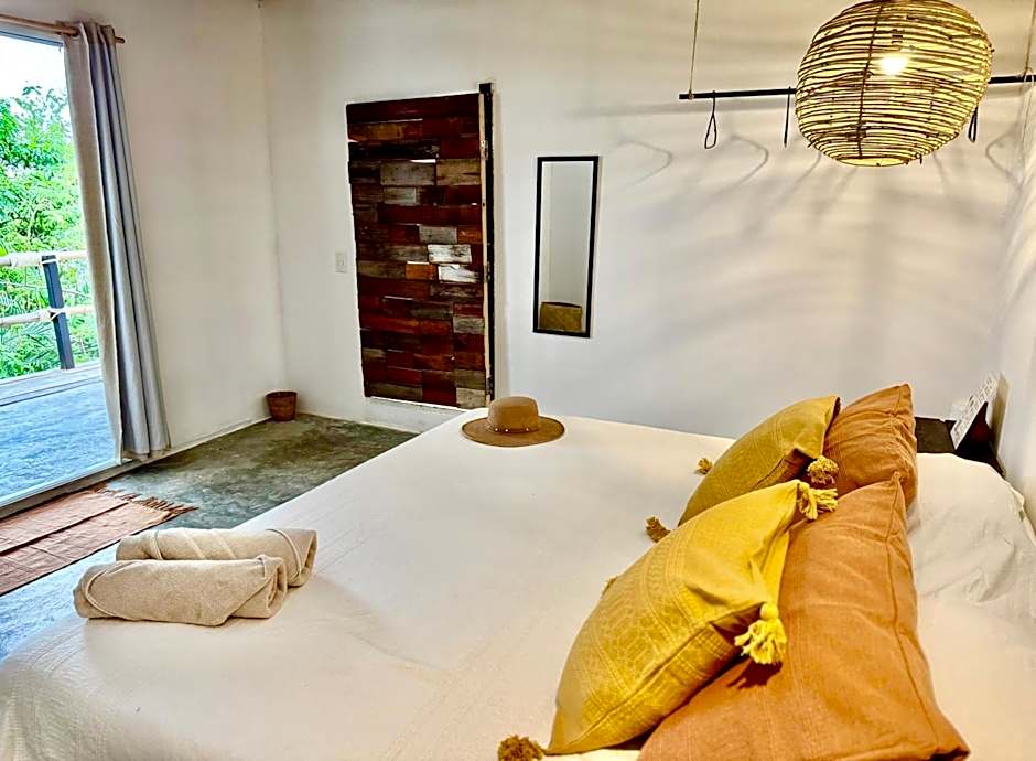 Ascending the stairs, you will reach the bedroom, where a comfortable king-size bed awaits for peaceful rest. This intimate and tranquil space will allow you to relax and recharge for your days at Edén Escondido. The bungalow offers a sense of tranquility and privacy, allowing you to disconnect and immerse yourself in a relaxing ambiance. You can enjoy moments of peace in your own space and unwind amid the surrounding natural beauty.