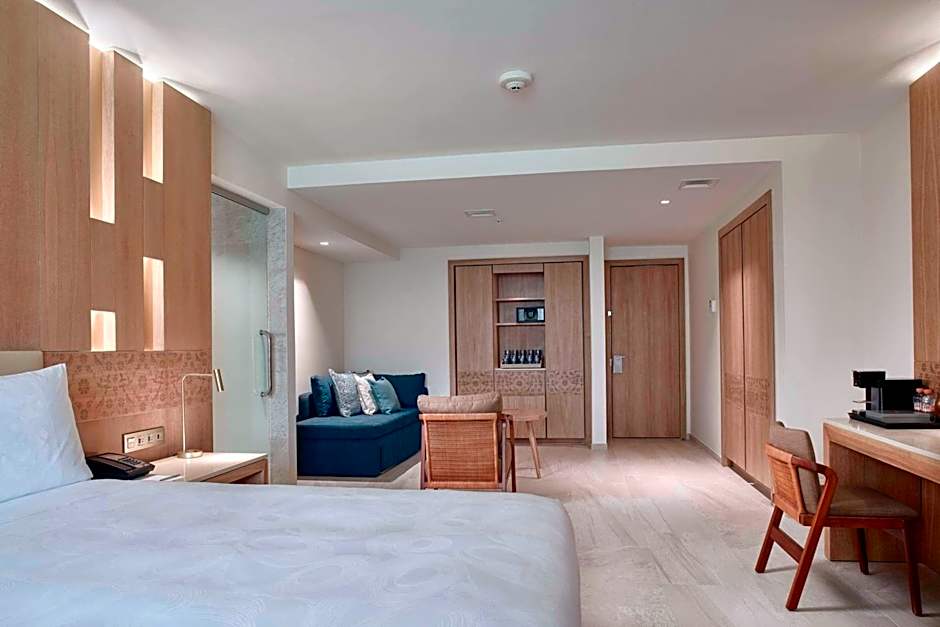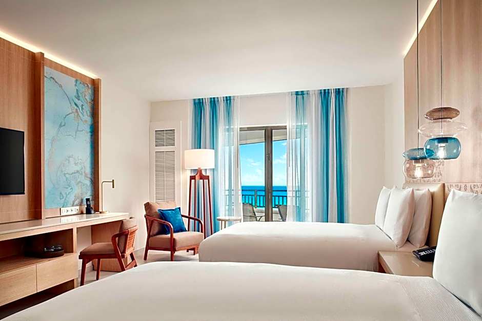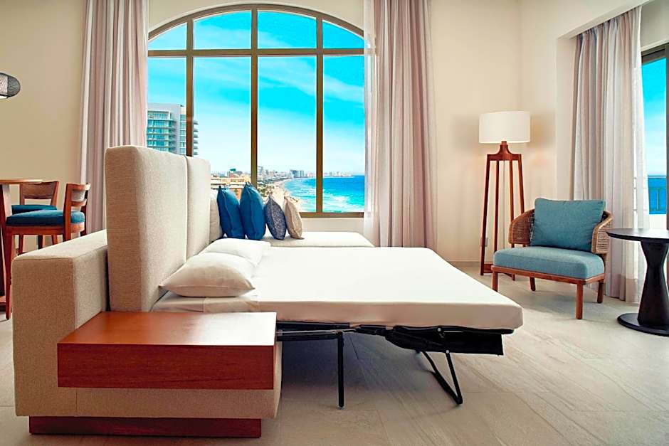 The JW Suites feature a living area and a private balcony with ocean and pool views. They come with luxury furnishings and amenities.