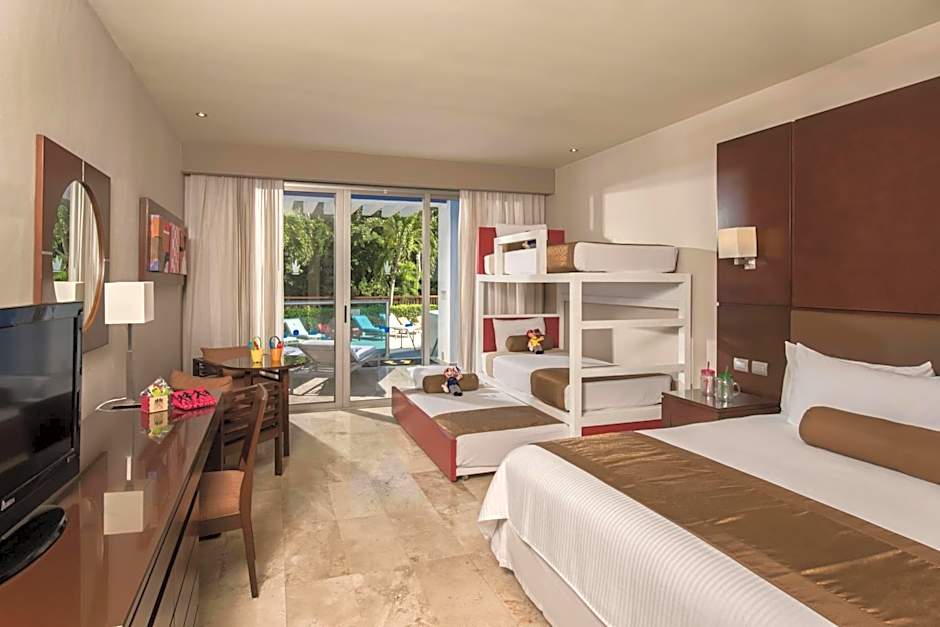The Grand Riviera Princess - All Inclusive hotel offers a variety of rooms including the Deluxe Junior Suite, Family Club - Pool Access, Family Club Room, and Deluxe Junior Suite with Pool Access. These rooms range in size from 603 sqft to 635 sqft. Smoking is not allowed in any of the rooms. The rooms can accommodate different numbers of adults and children, with bed configurations including king size beds, bunk beds, double beds, and sofa beds.